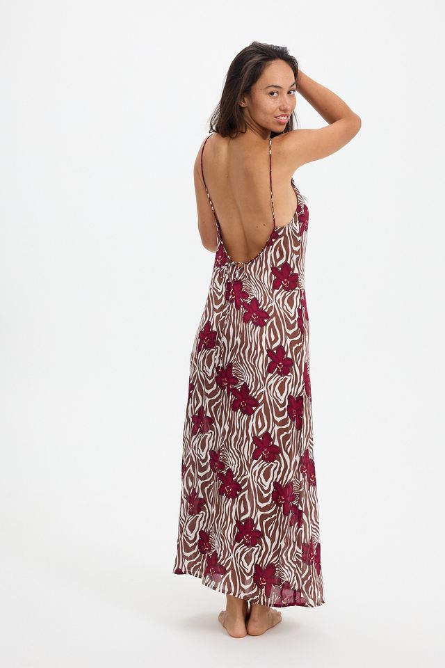 The absolute favorite dress silhouette (be careful she wonʻt last long)!  With a flattering slit, low back details, and Benoaʻs popular Diva print, it is the perfect touch of sophisticated and Hawaiʻi.