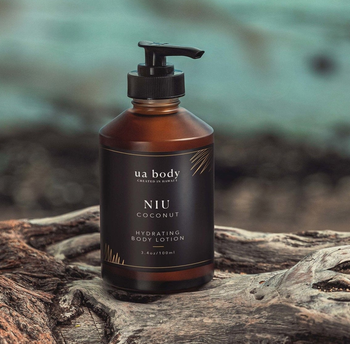 Hawaiian distilled water, emulsifying wax, sweet almond oil, mango butter, glycerin, organic virgin coconut oil, aloe extract, kukui oil, fragrance, optiphen, vitamin E