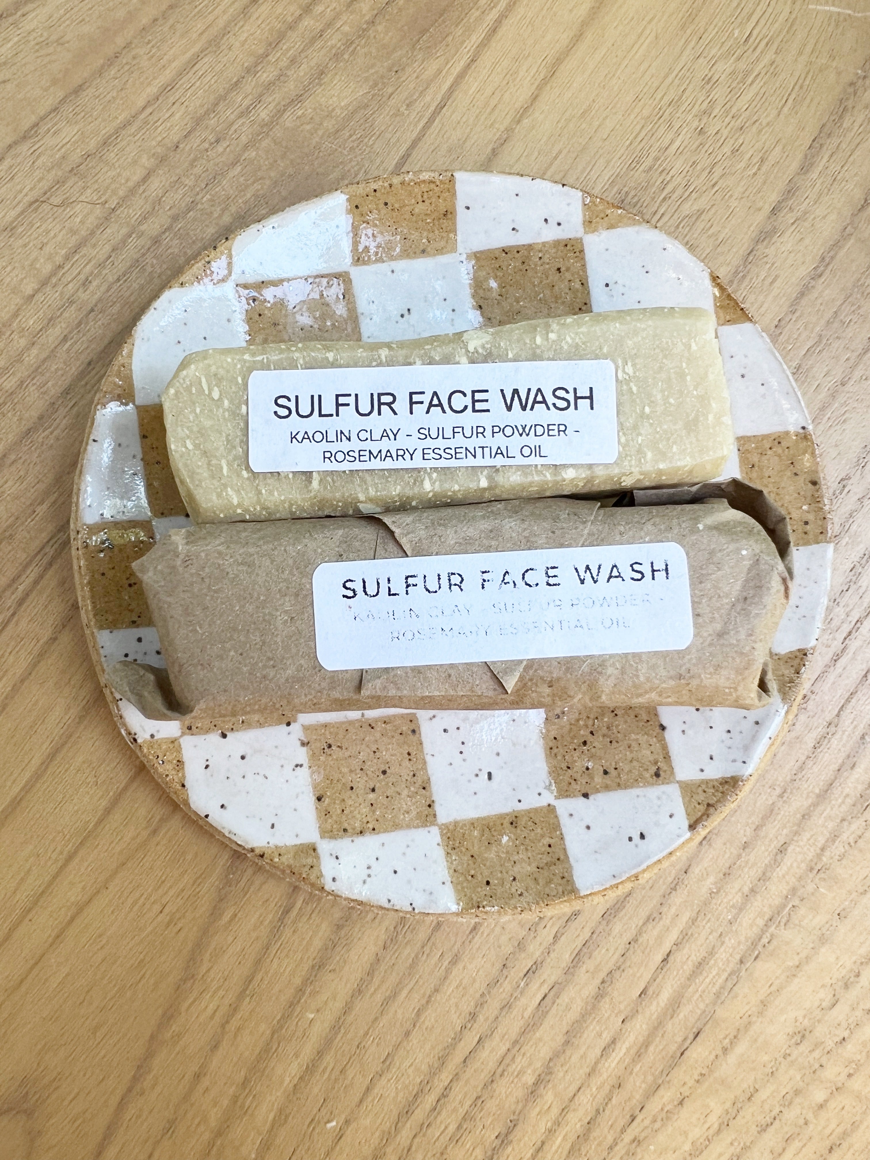 This Sulfur facial cleansing bar is made with pure sulfur powder, kaolin clay and rosemary essential oil. All of these ingredients are carefully chosen for extra oily skin types and also to aid skin ailments such as acne, rosacea and eczema.