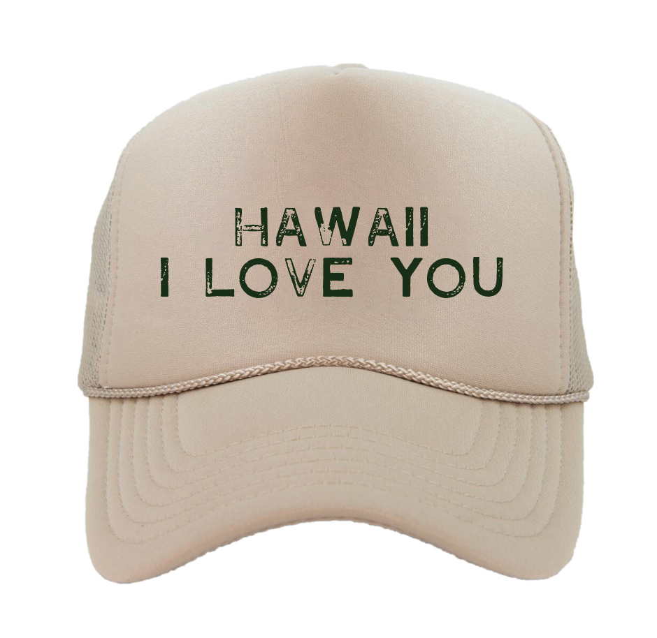 Hawaii I Love You. Share the aloha with this amazing new trucker hat style made in a neutral wearable color combo! Traditional Foam front and mesh back. Perfect for a day at the beach or anywhere outdoors.