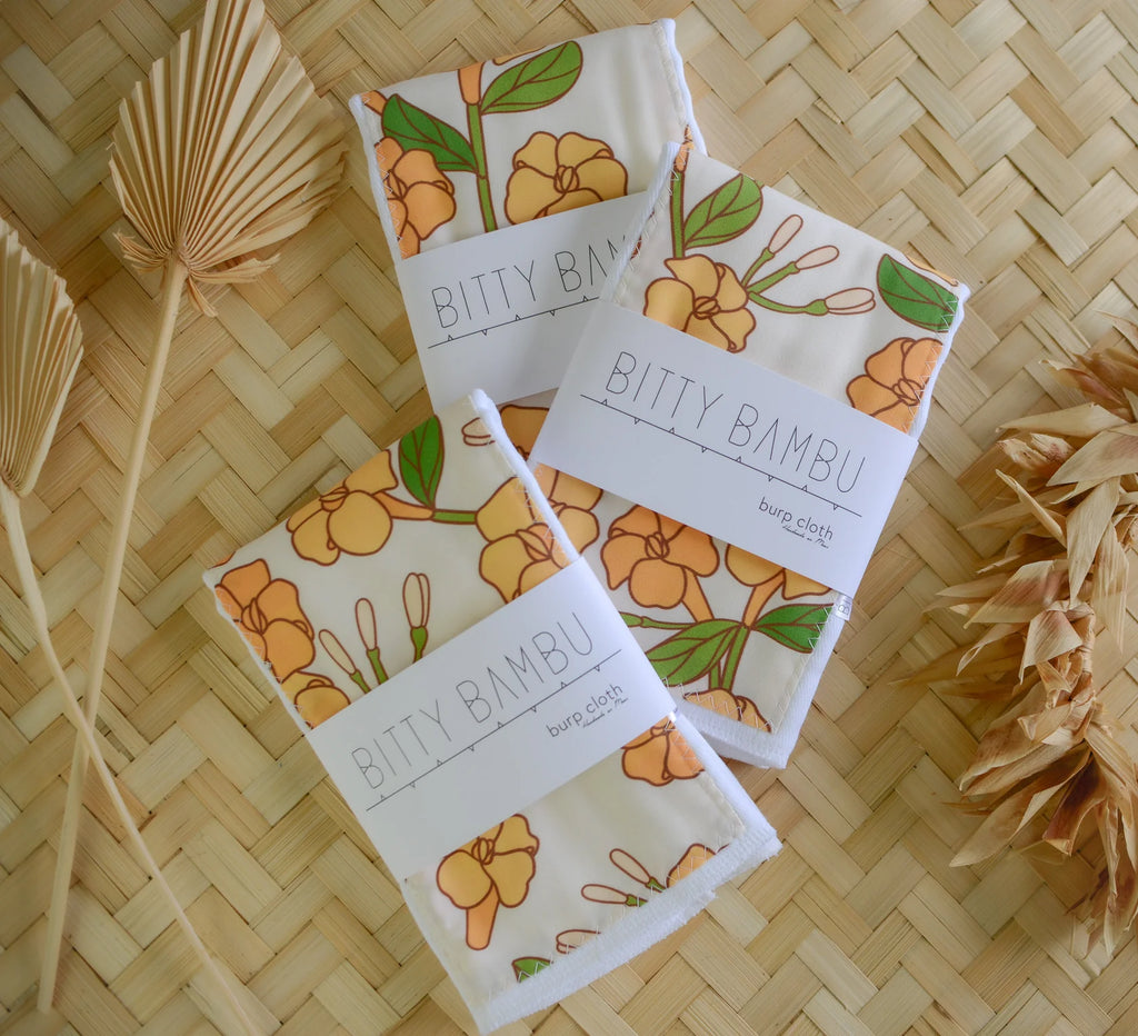 Check out these cotton burp clothes adorned with local designs. Made on Maui with love. Package includes one burp cloth.