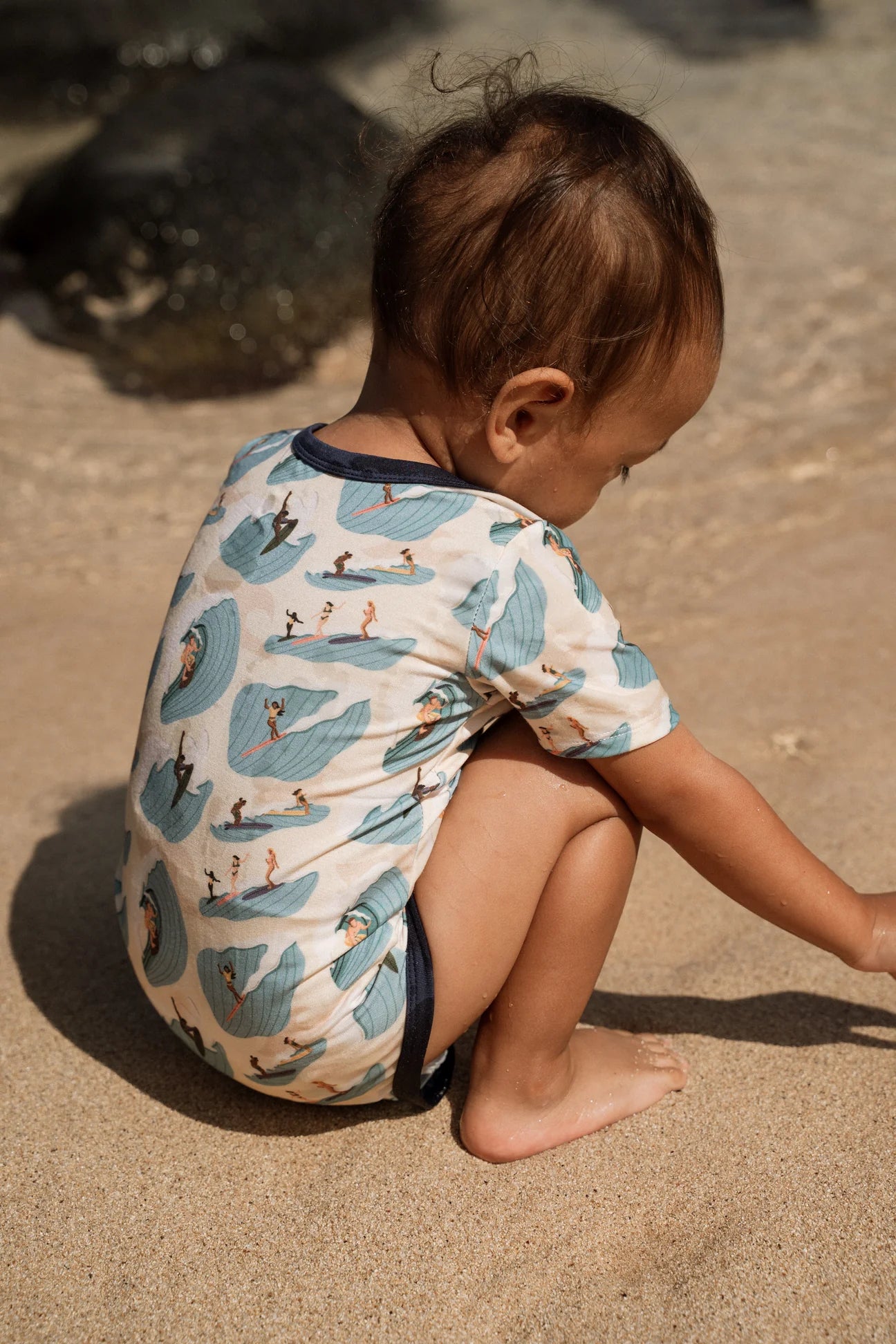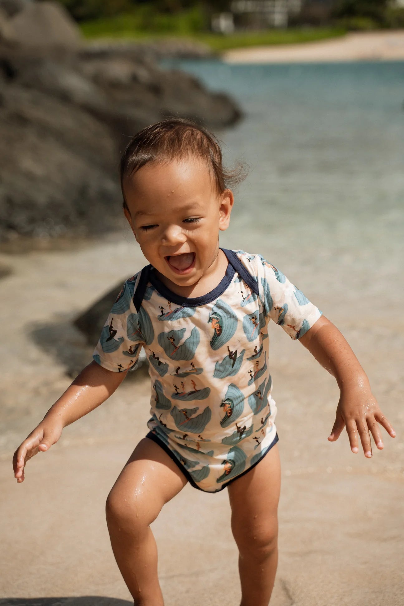 This adorable new onesie features a playful surfer print, designed on Oʻahu and perfect for your little beach babe. Crafted to transition seamlessly from day to night, it can be layered with shorts or pants for added versatility. The open leg design and relaxed sleeves make it comfortable for every season, keeping your keiki cool and cozy all year long.