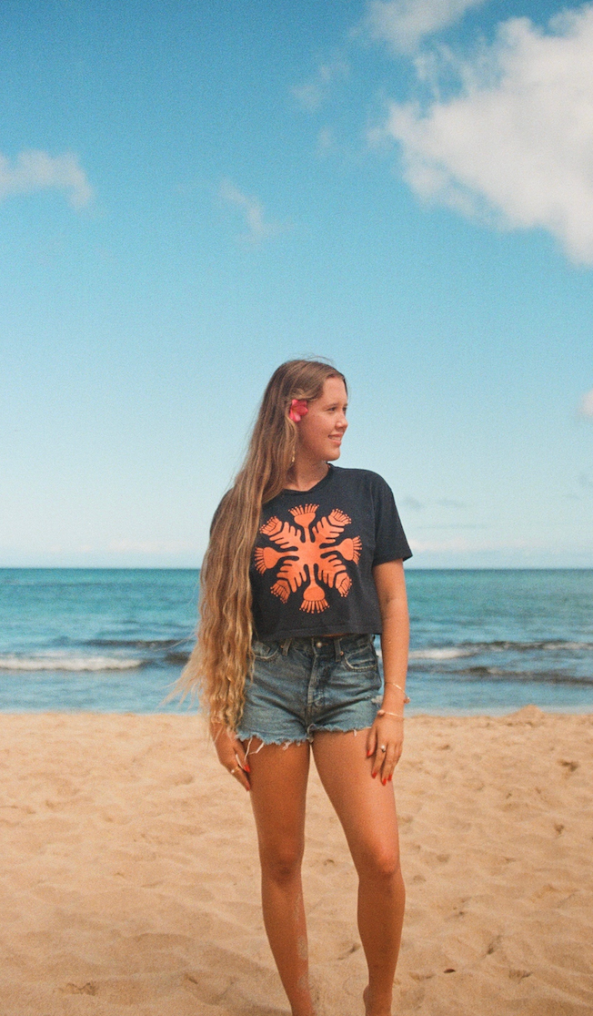 These crops are designed and screen printed on Maui. They are 5.5 oz., soft-washed, 100% combed ring-spun cotton. They feature a crew neck, drop shoulder, are ultra soft, side-seamed, and tightly knit.