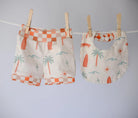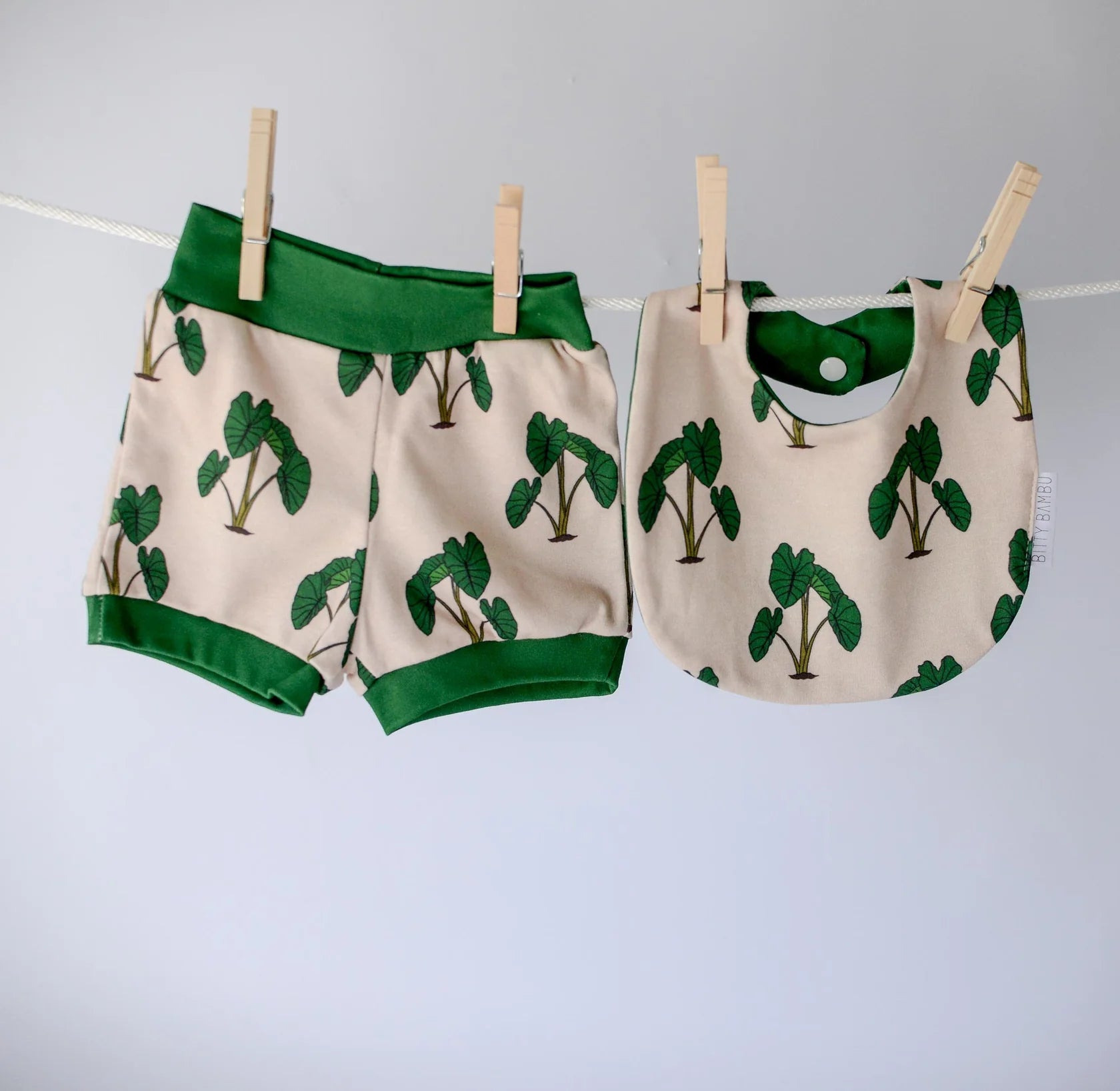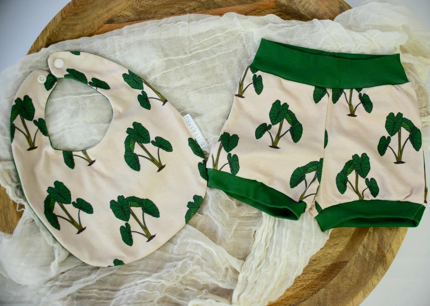 Soft and stretchy organic knit baby shorts and matching bib featuring the taro / kalo design with contrasting trim.These bummies are perfect for layering over diapers. Designed with comfort in mind, they pull on easily without tight elastic and are made with eco-friendly materials that are gentle on baby’s delicate skin. A must-have for your little Hawaii baby's wardrobe.