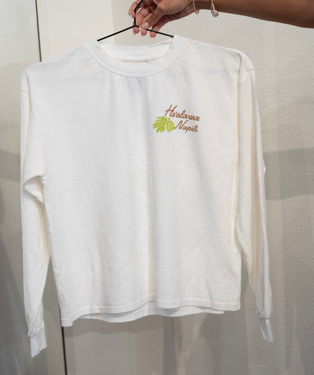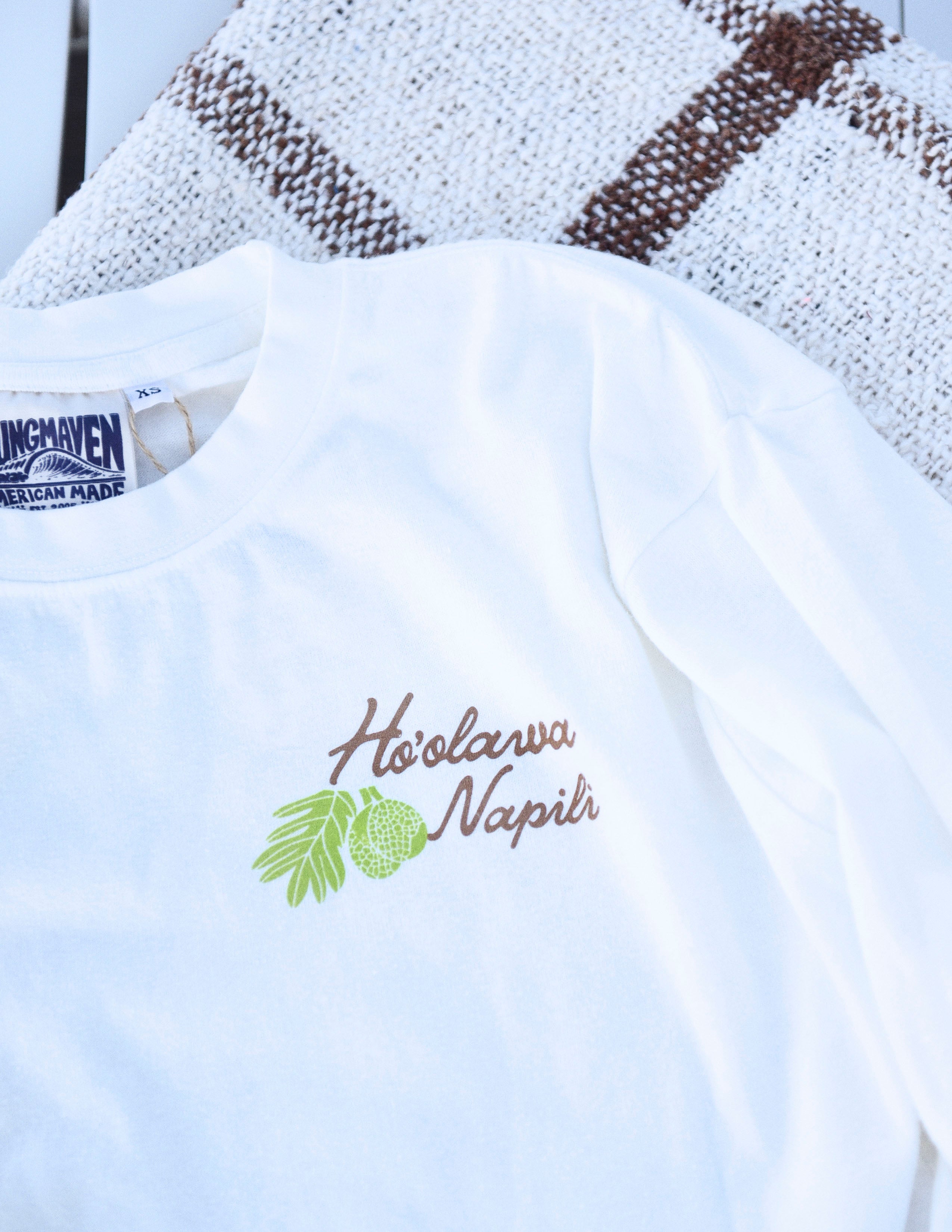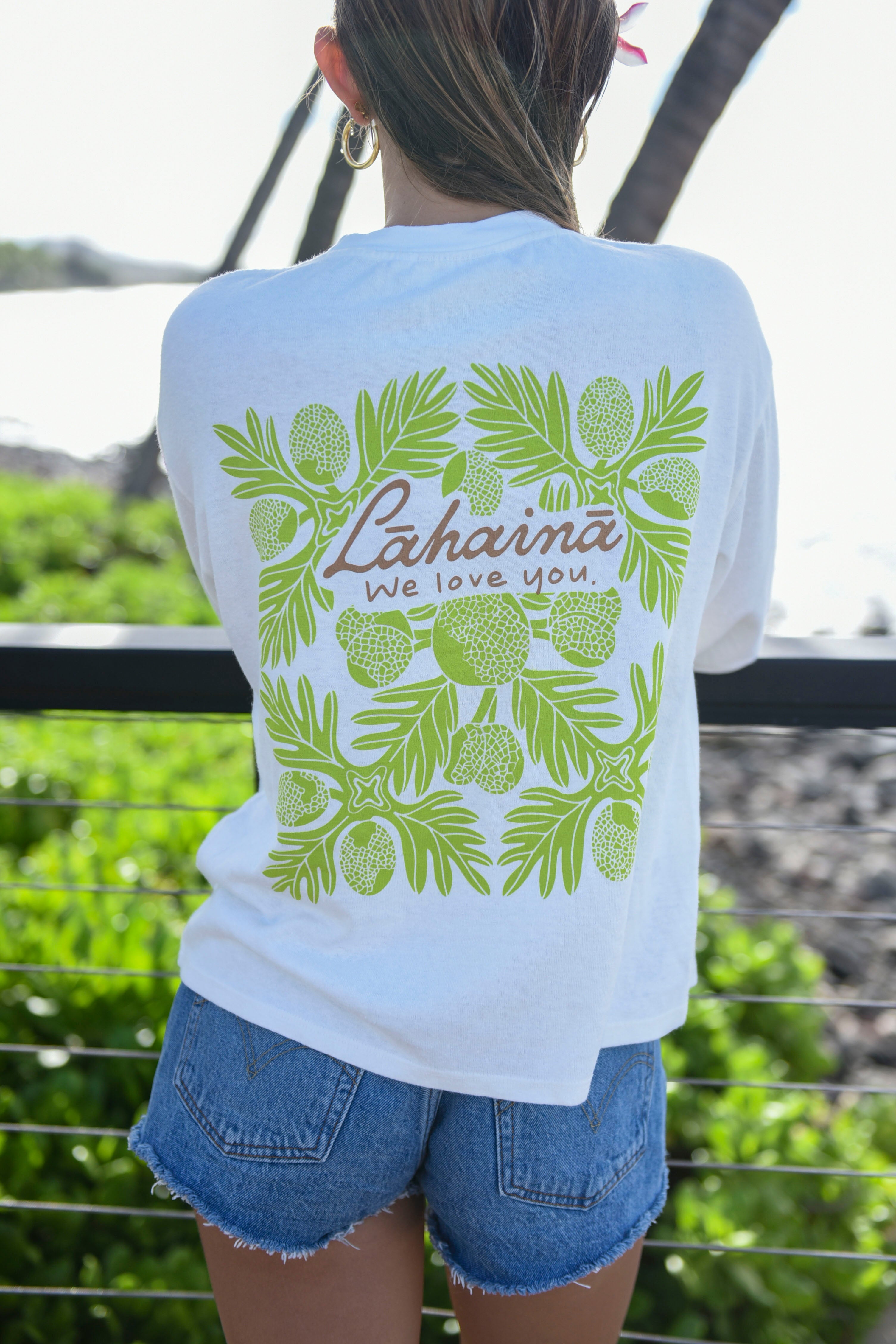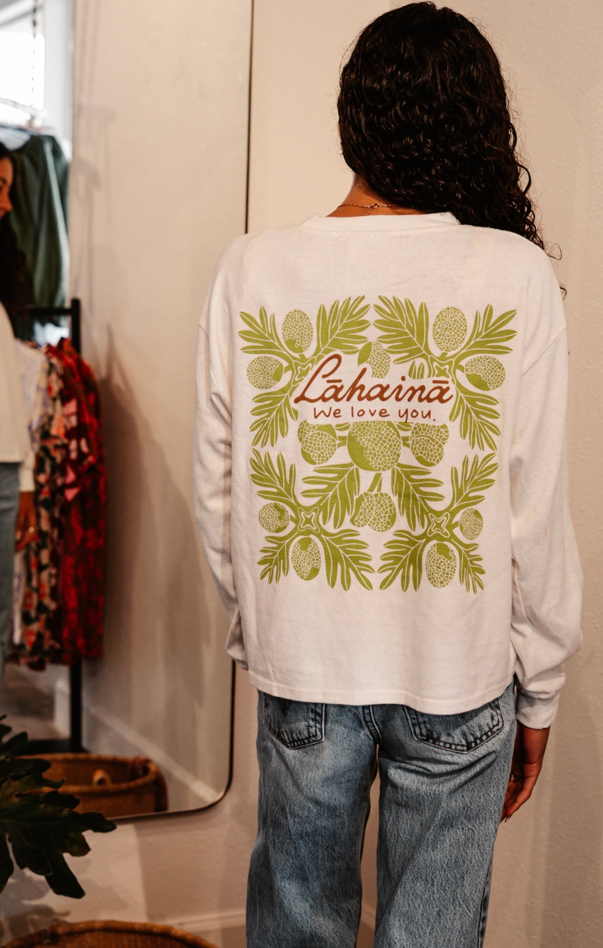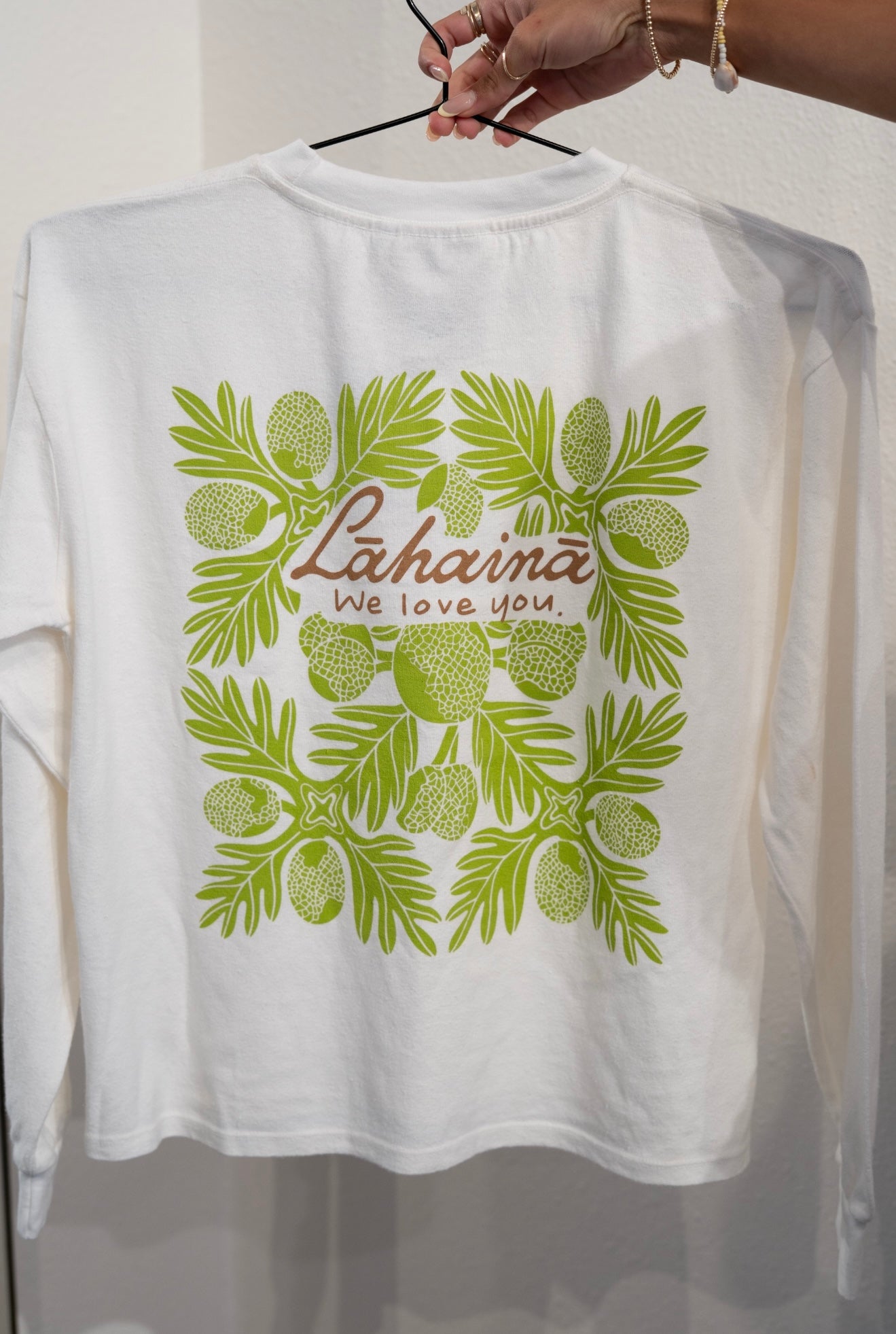 This soft, sustainable JUNGMAVEN cropped long sleeve features our “Lahaina We Love You” print alongside the beloved ‘ulu (breadfruit) motif — a symbol of resilience and abundance.