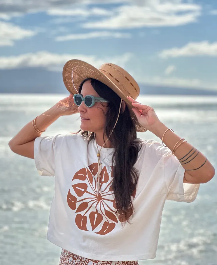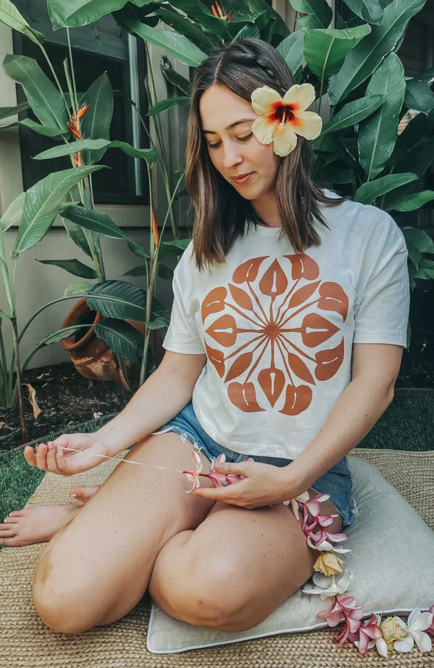 Although not native to Hawai’i, this stunning flower was introduced in 1889 from the rainforests in the Americas. Since then, it has become a staple in Hawaiian floral designs. This beautiful flower is known universally as a symbol of hospitality. Designed and screen printed in Lahaina Maui on 100% cotton tee made in the US in an eco friendly and ethical way.