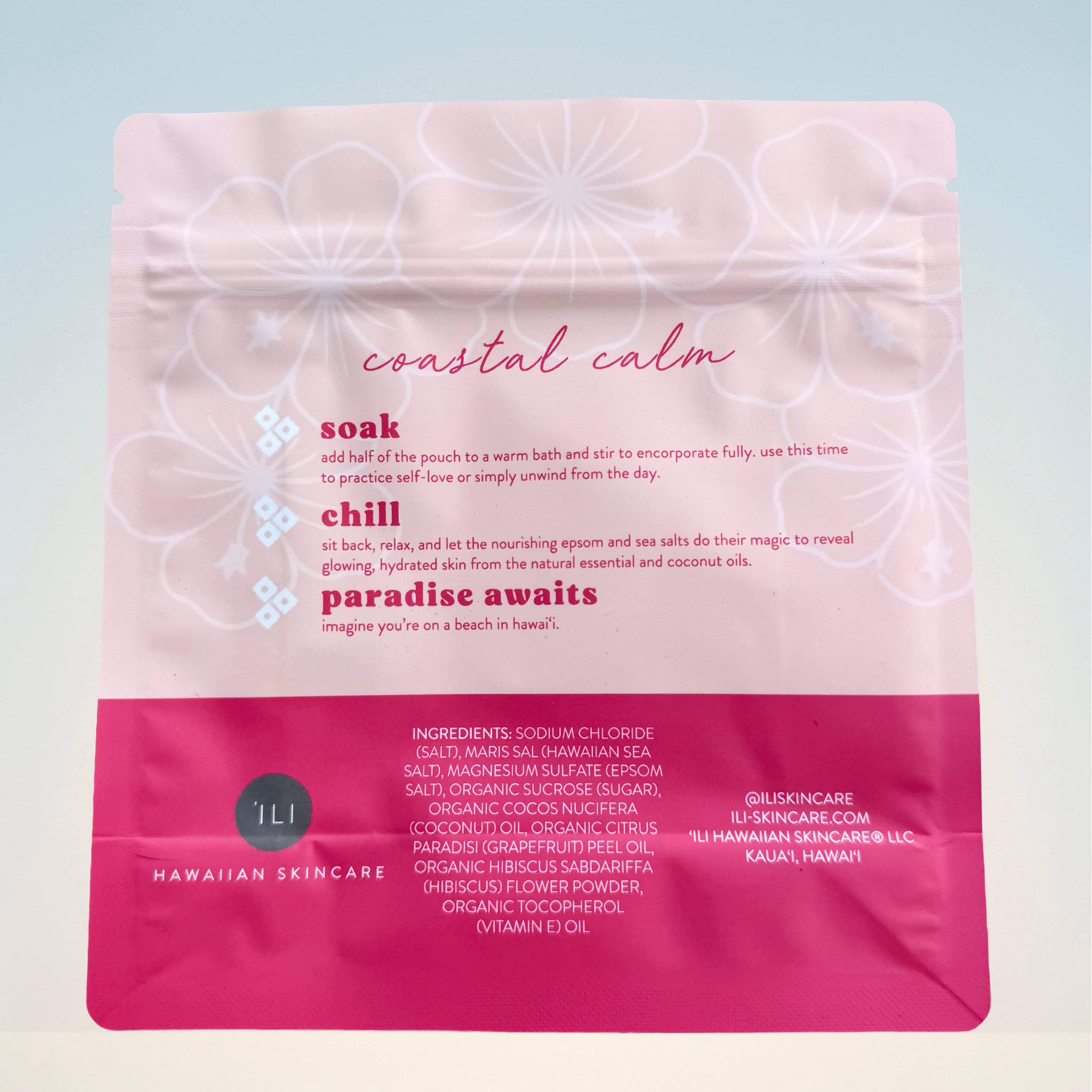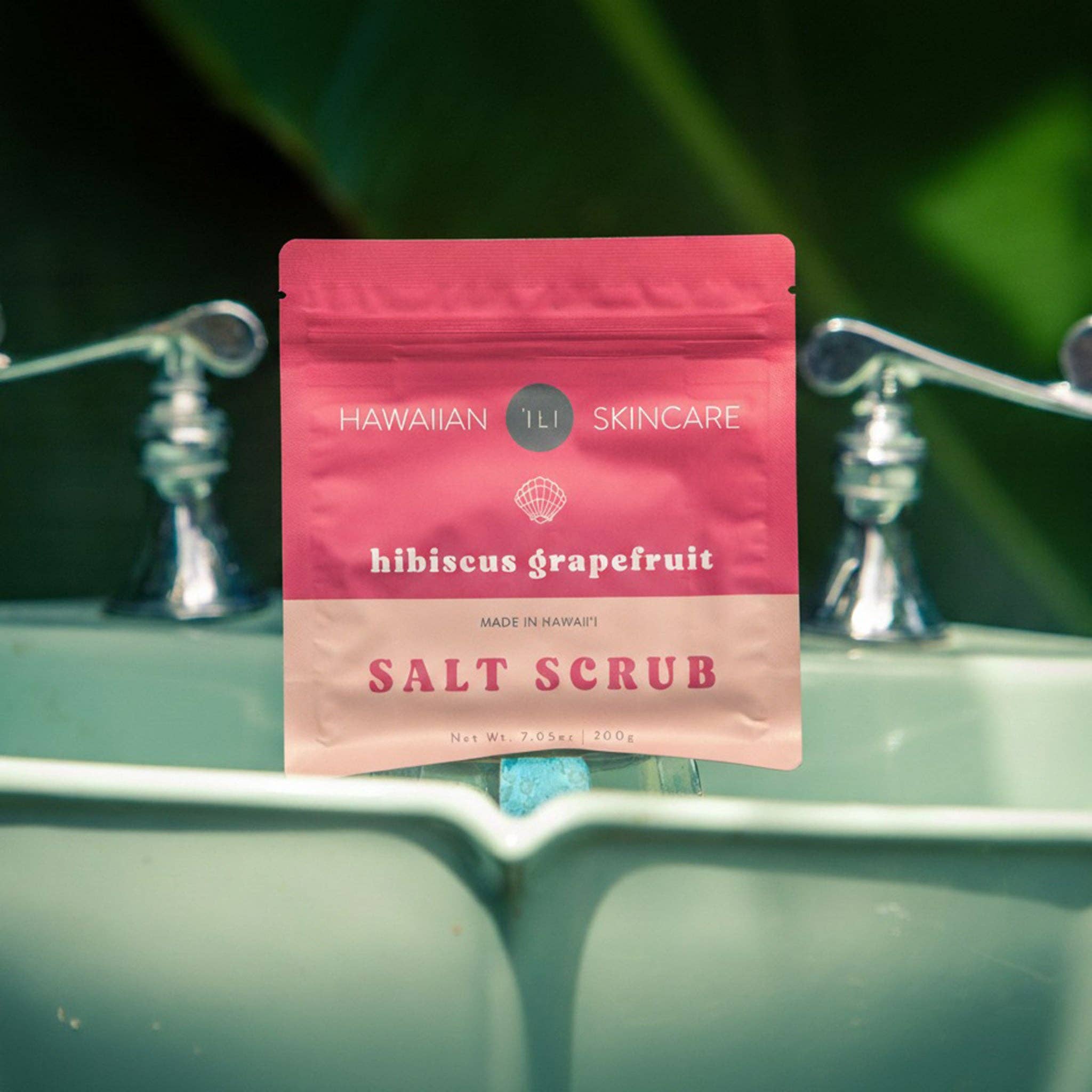Ingredients: Sodium Chloride (salt) Maris Sal (Hawaiian Sea Salt), Organics Sucrose (sugar), Organic Cocos Nucifera (Coconut Oil), Organic Citrus Paradisi (grapefruit) Peel Oil, Organic Hibiscus Sabdaruffa (Hibiscus) Flower Powder, Organic Tocopherol (vitamin e) oil.