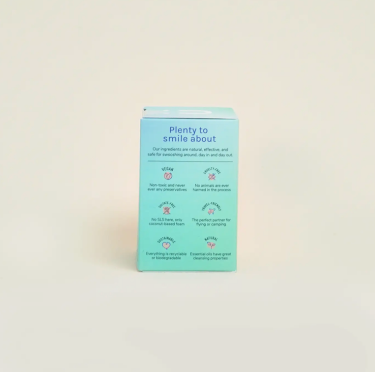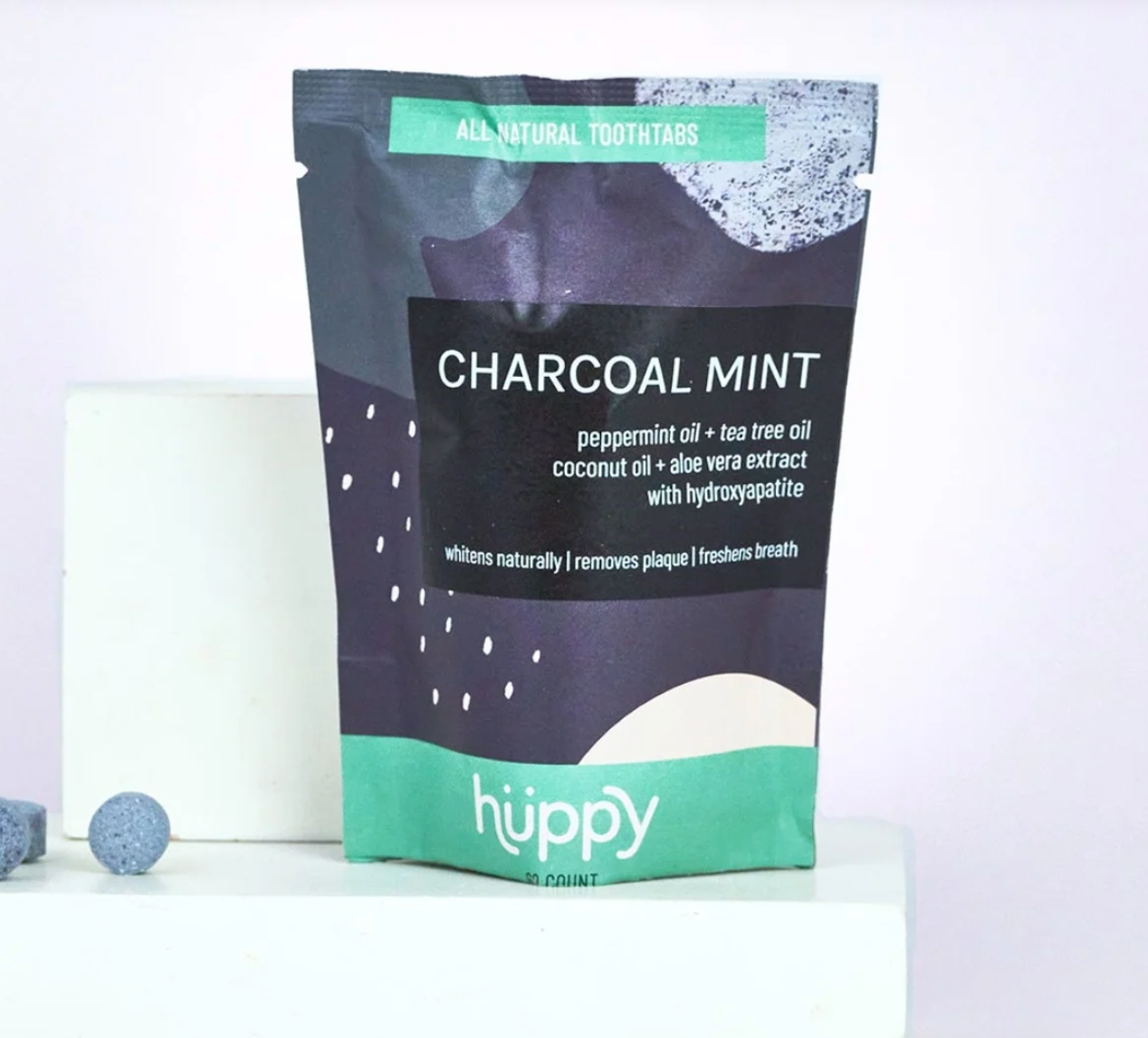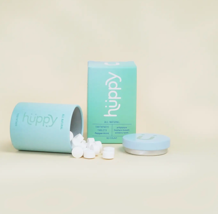 Huppy Toothpaste Tablets made with Peppermint are a toothpaste alternative that naturally whitens, fights plaque, and freshens breath without adding more plastic waste to our environment.